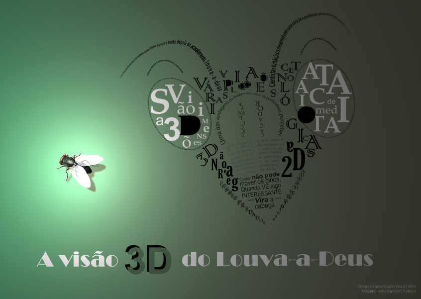 - Por fim, o título foi dividido em duas partes: a branco, em Broadway (regular), uma letra criativa, dinâmica, com traços finos e grossos, mostrando que a visão do louva-a-deus não é rígida, uniformizada, simétrica, mas que tem dimensão; e as palavras "3D", sobrepostas de modo a criar a ilusão de letras tridimensionais, em Arial (bold), um tipo de letra minimalista que facilita uma rápida assimilação.