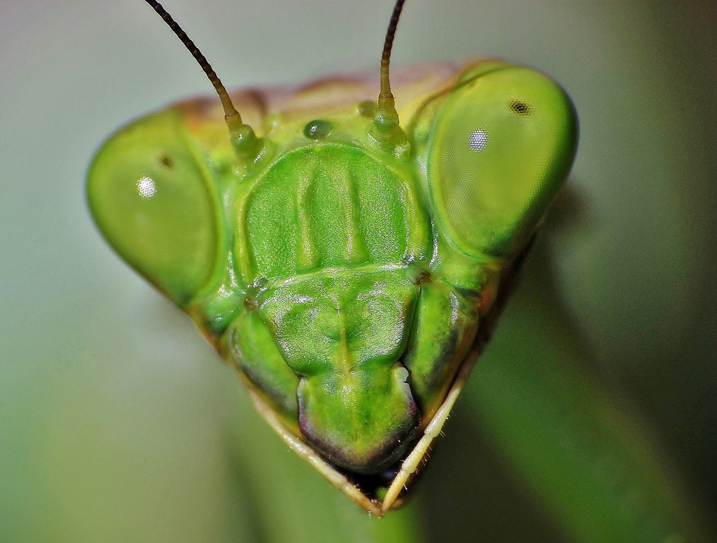 No canto superior dieito, a cabeça de um louva-a-deus, com os seus grandes típicos olhos bem abertos, a fixar um inseto a 3 dimensões;